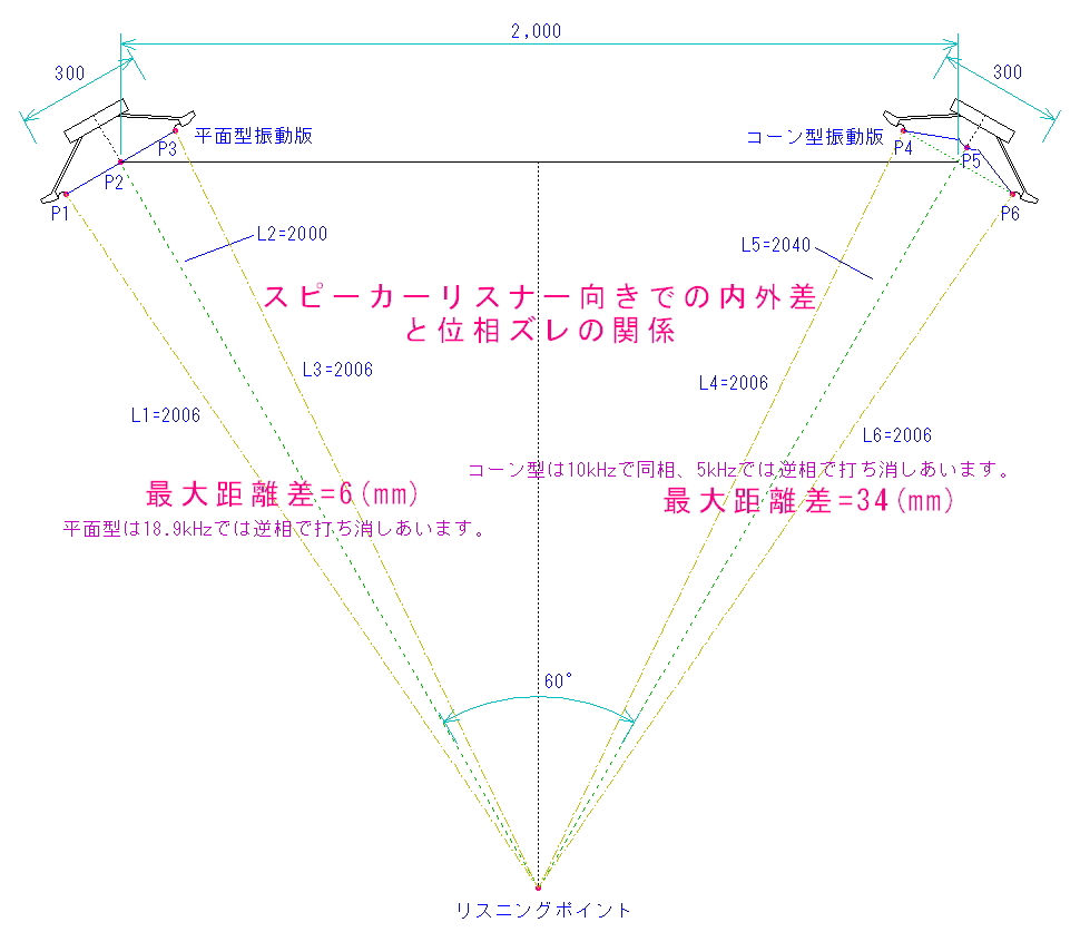 | スピーカーをリスナーに向けるのは位相ズレを押さえるのに有効です。 平面振動板で6mm、コーン型でも34mmの距離差。 逆相になる周波数が18.9kHz、5kHzと高いので聴感では分からないかもしれません。 やはり大口径よりは小口径有利ですが、リスナー向きなら位相ズレは『大口径でも気にならない』と思われます。 |