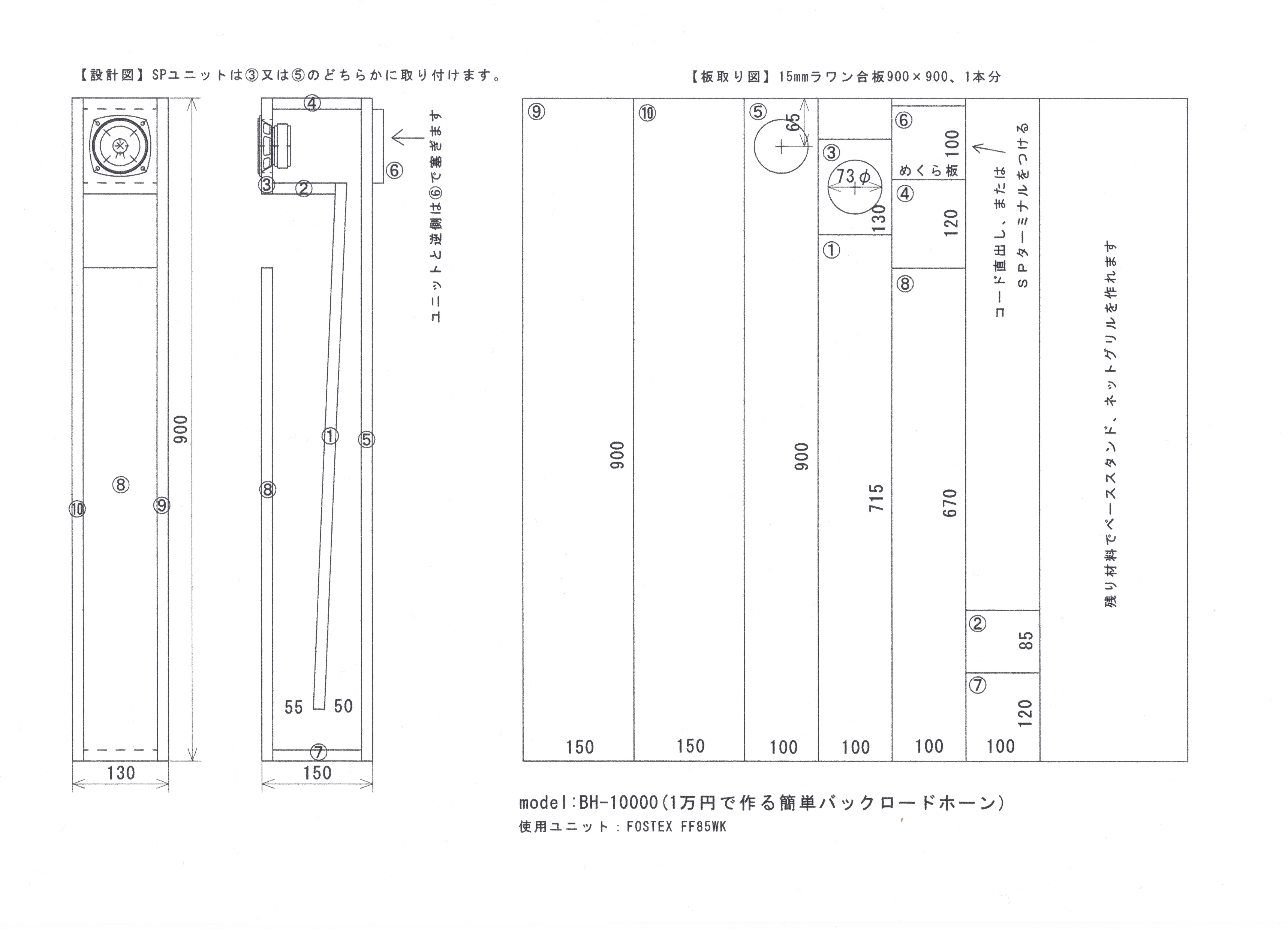 | ■BH-10000 自作初心者、バックロード初心者のための、 2本1万円で作る失敗しない!?お手軽バックロードホーン。 使用ユニット:フォステクス FF85WK 材料:15mm厚ラワン合板(910×1820-1枚)/2本分 ボンド、クギ、SPターミナル等 本体サイズ:130×900×150mm |
