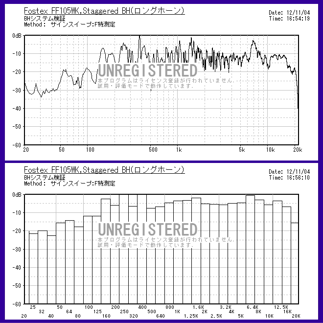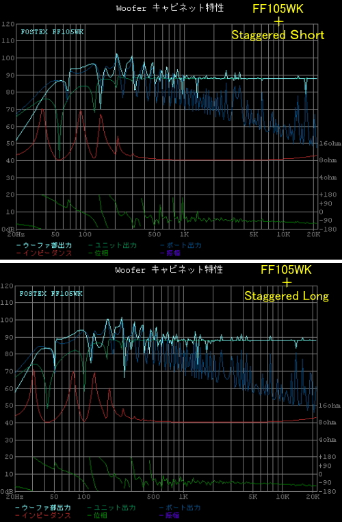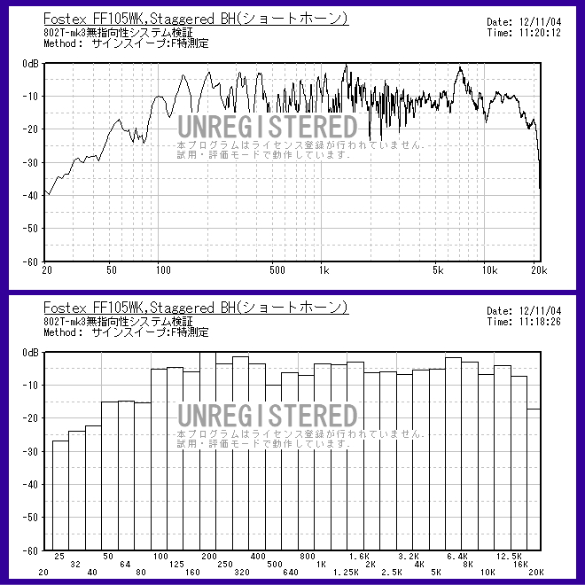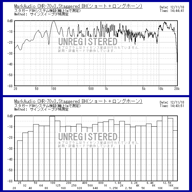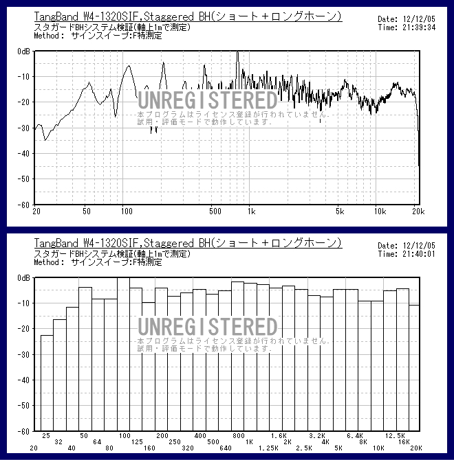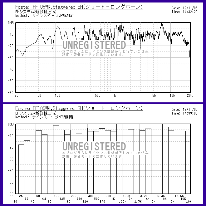 | 上のグラフはショートホーン使用時の特性。 下のグラフはロングホーン使用時の特性。 2つのホーンをスタガーで使うので、2つのグラフを足して2で割ったような特性になる予定です。 特性のアバレも減少してフラット方向になると思われます。 |