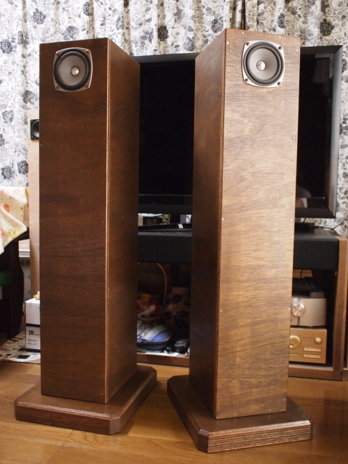 | ベースを取り付け、オリンピックステインでコーヒー色に着色、透明ウレタンニスを塗ってみました。 ベース(15mmベニヤ3枚重ね)のサイズはW298×H45×D348mm。 土台がラワン合板でも塗装すればなかなか良い感じになります♪ で、「音は良くなったか?」と聞かれたら『わかりませ〜ん』と答えます(爆) |