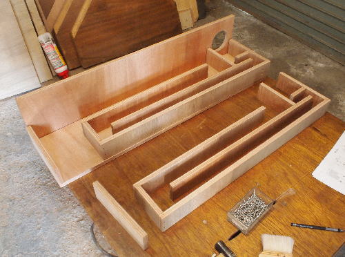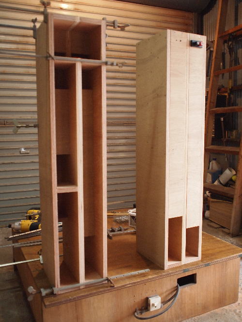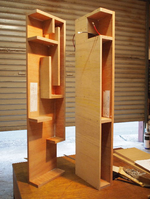 | 【製作】 ロングホーン部とショートホーン部を別々に作ってから合体させます。 合体後、フロントバッフルを付ければ完成。 といっても、、、難易度は少々高めです。 尚、正確にカットしておかないと最後に合わなくなるので要注意。 今回はエンクロージャ中心部の7mmベニヤが入手できなかったので、代わりに9mmベニヤを使用しました。 この部分は7〜15mmでOKですが、厚みが増えた分、空気室が大きくなるので微調整してください。 |