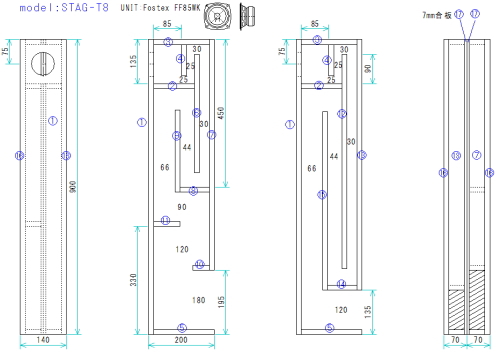| 【使用ユニット】Fostex FF85WK、MarkAudio Alpair6M(6P)、他8cmフルレンジ 【材料】 15mm厚ラワン合板1820×910mm、1枚(2本分) 7mm厚ラワン合板910×910mm、1枚(2本分) SPターミナル、コード、ボンド、クギ等 【本体サイズ】140×900×200mm(W,H,D) |