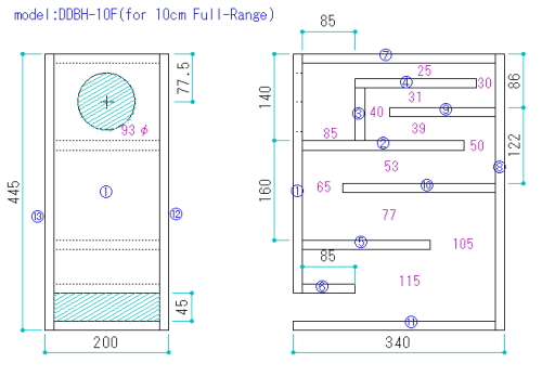 | model:DDBH-10F (10cmフルレンジ・前面開口型ダンプダクト・バックロードホーン) 前面開口型のダンプダクト入門用BOXです。 三六板1枚で2台分取れる小型タイプBHですが、低域レンジは必要十分です。 また、締まりの良い低域ですので、駆動力が弱く一般的にバックロード向きではないユニットでも問題なく使えます。 |