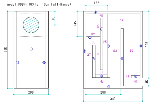 | model:DDBH-10R (10cmフルレンジ・背面開口型ダンプダクト・バックロードホーン) 背面開口型のダンプダクト入門用BOXです。 三六板1枚で2台分取れる小型タイプBHですが、低域レンジは必要十分です。 また、締まりの良い低域ですので、駆動力が弱く一般的にバックロード向きではないユニットでも問題なく使えます。 |