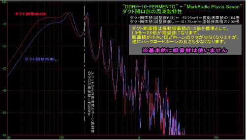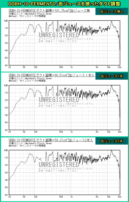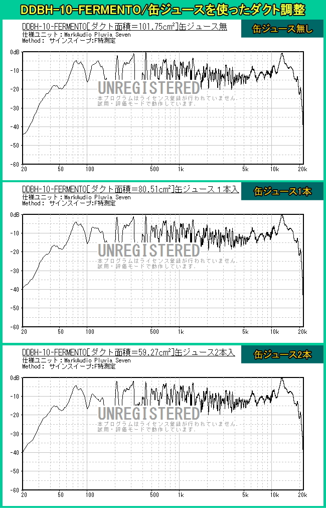 | ダクト調整が影響する帯域は500Hz以下で、特に200Hz以下の変化が大きくなります。 100Hz以下は変化量が分かりにくいですが、聴感での変化は大きく感じます。 基本的に断面積が小さいほど量感が減りますが、其の分ローエンドが伸びて締まりが出てきます。 |