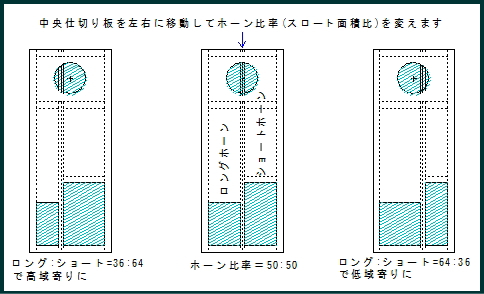 中央仕切り板を左右に移動させてホーン比率(スロート面積比)を変えることによって、帯域バランスを整えることが出来ます。 |