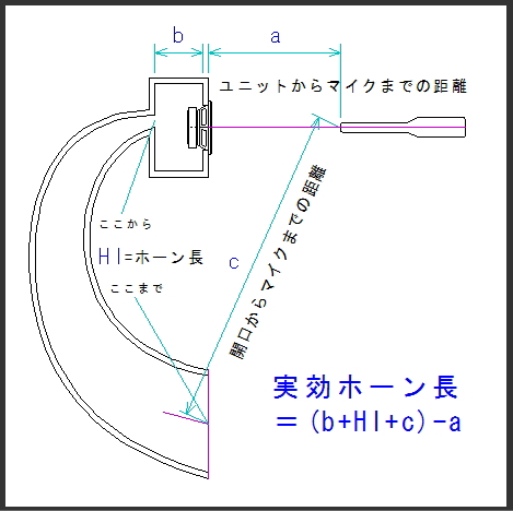 | 実際のバックロードホーンSPの使用では、実効ホーン長の分、位相がズレます。 実効ホーン長=(b+Hl+c)-a ・a=ユニットからマイクまでの距離 ・b=ユニット背面からホーン入り口までの距離 ・c=ホーン開口中心からマイクまでの距離 実効ホーン長が変われば、正相、逆相になる周波数も変化しますので、周波数特性のピーク、ディップの位置も変わることになります。 |